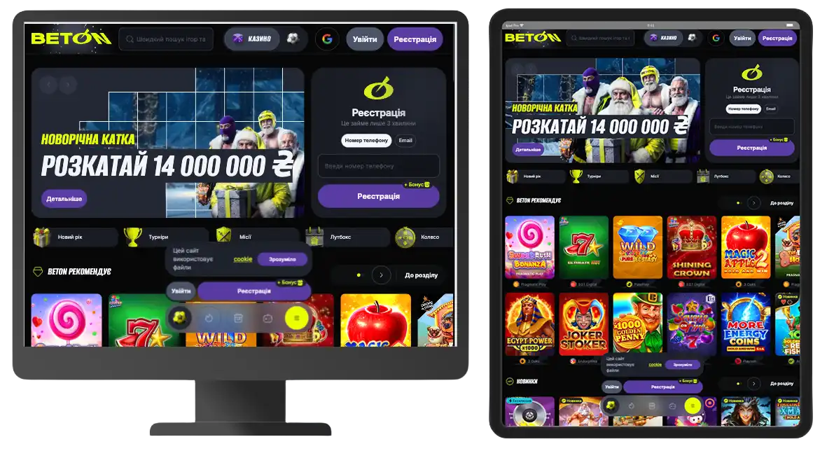 Нове онлайн казино BETON функціонує за ліцензією КРАІЛ №364 від 03.11.2023 та пропонує користувачам понад 6000 ігор від більш ніж 69 студій, включно з Pragmatic Play, Playson, 3 Oaks, EGT Digital, Microgaming, NetEnt, Amusnet, Endorphina, Spinomenal та іншими. Нові гравці можуть скористатися вітальним пакетом до 250 000₴ та 500 обертань на перші п’ять поповнень рахунку (1-й, 2-й, 3-й, 5-й та 7-й депозити). Величина бонусу та кількість обертань залежать від суми кожного поповнення. Серед постійних акцій — тижневі бонуси, повернення частини програних коштів, спеціальні пропозиції для підписників Telegram-каналу, а також турніри з призовими фондами.